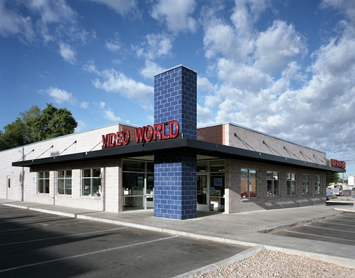 Color and the straightforward use of materials distinguish this 6000-square-foot retail building located in Albuquerque’s Nob Hill neighborhood. A dark blue pre-glazed masonry tower announces the entry and calls attention to the building from Central Avenue. The contrasting color of ceramic tile which clads the parapet above the glass curtain wall further dramatizes the entry. Both the tower and this entry notch are illuminated at night.
