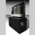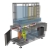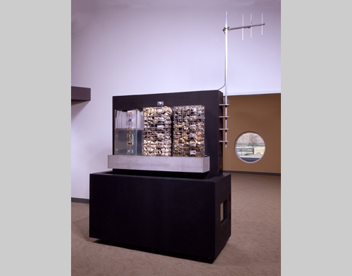 This sculpture measures water flow in the Rio Grande at Albuquerque. The left panel of the triptych consists of a transparent reservoir. The water level in the reservoir changes with stream flow in the Rio Grande. A gauging station near the Central Avenue Bridge measures the stream flow. This data is transmitted by FM radio signal from the gauging station. This sculpture receives the data. A programmable controller processes the data and regulates the level in the reservoir as a hydrograph of actual stream flow.